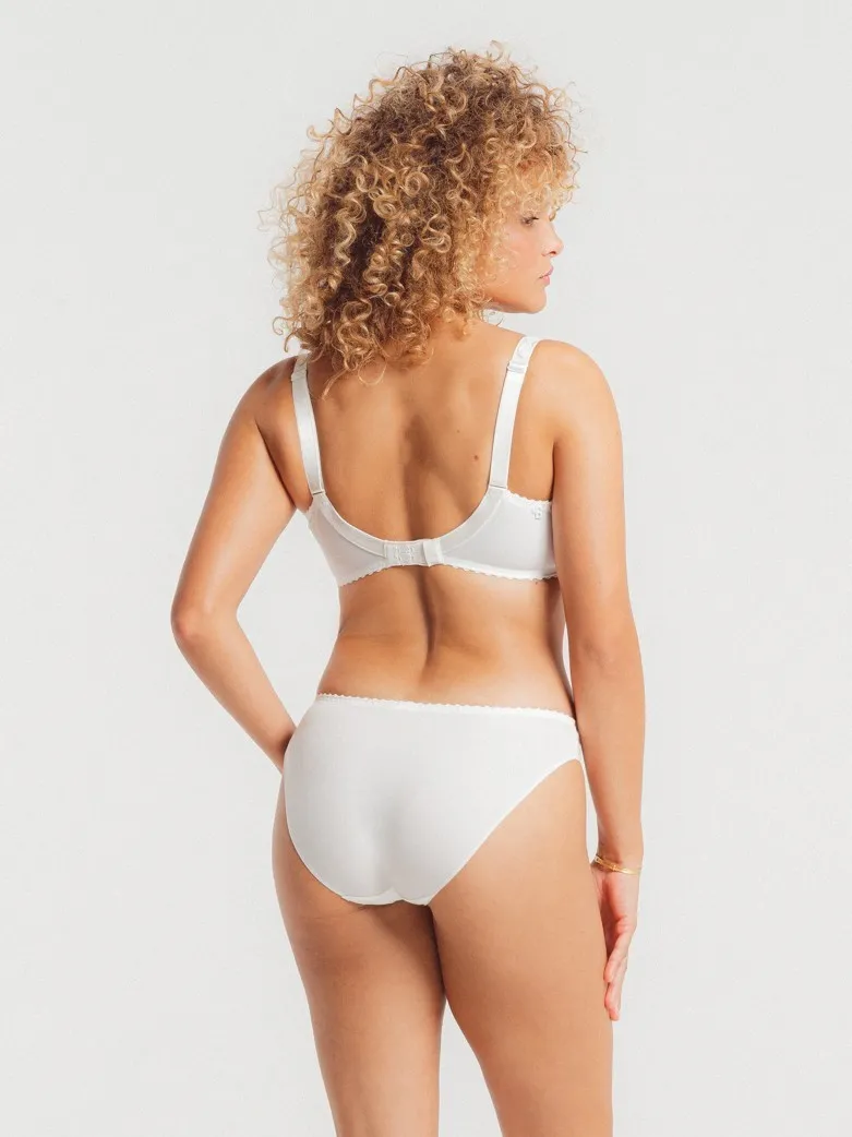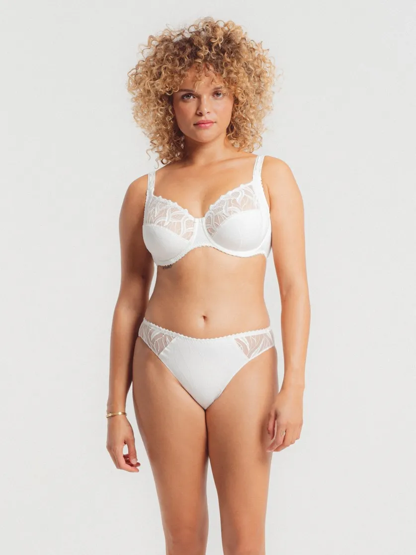 Классические трусы-бриф Луиза Брак Джулия молочно-белого, натурального цвета - Louisa Bracq Julia rio brief nacre 477 30 NCR. Выполнены из непрозрачной ткани, текстурированной впереди и шелковисто-гладкой сзади. Украшены полупрозрачными кружевными вставками с мотивами ар нуво. Край изделия по линии талии - на тонком эластичном поясе-резинке с кружевными оборками. Вырез ног обработан кромочным эластичным швом.