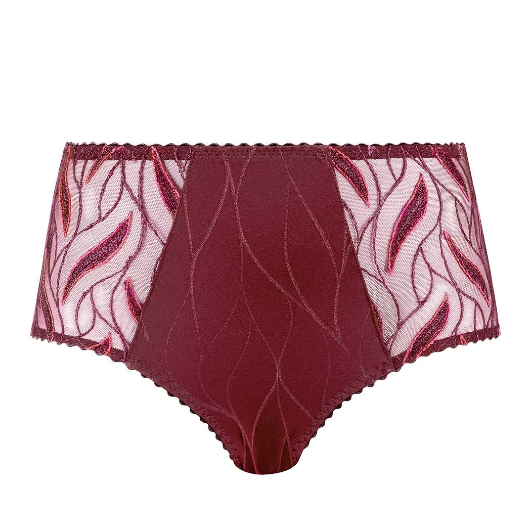 Высокие трусы-шорты Луиза Брак Джулия насыщенно-бордового цвета Кардинал - Louisa Bracq Julia full brief 477 50 CDN Cardinal. Впереди украшены широкими полупрозрачными вставками из вышитого кружева с мотивами ар нуво. Впереди по центру непрозрачная вставка из текстурированного материала, жаккардовые рисунки которого напоминают мотивы кружева. Сзади - из мягкого, матового, непрозрачного материала. По линии талии - узкий эластичный пояс-резинка с кружевной оборкой.