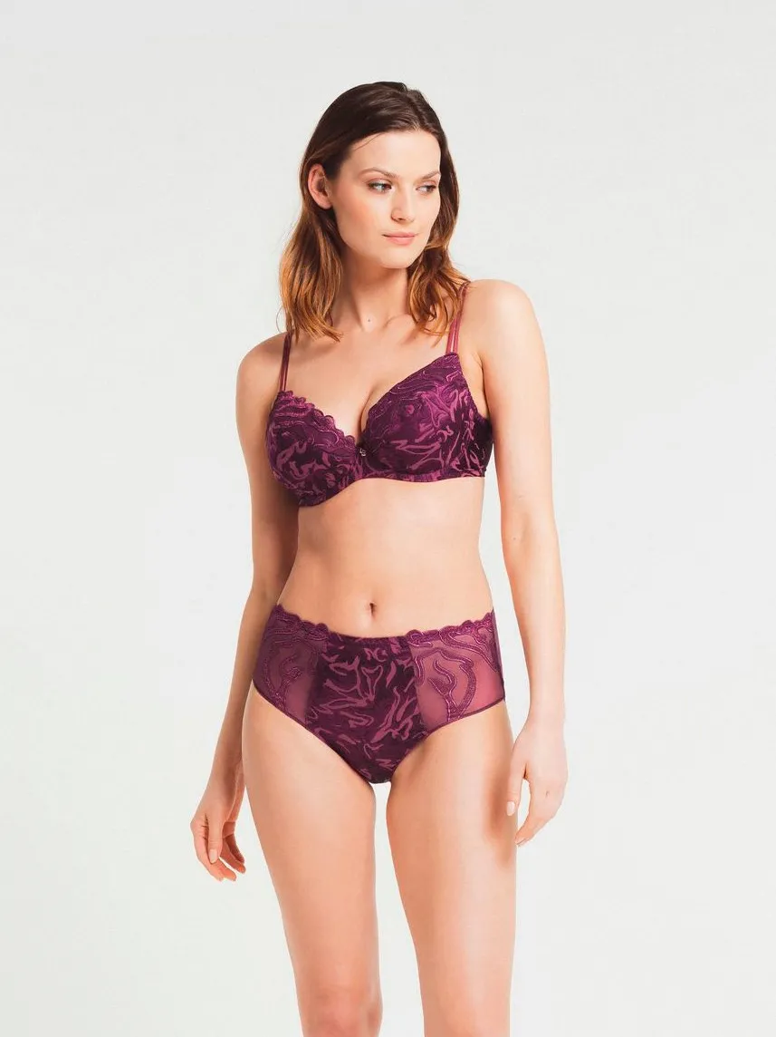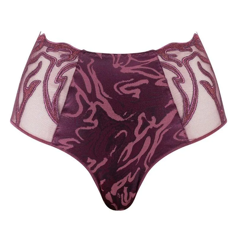Высокие трусы Луиза Брак Вортекс лилово-бордового цвета Гранат - Louisa Bracq Vortex culotte Full-Brief 497 50 GRN grenat. Завышенная линия талии скрывает живот. Выполнены из нежной, шелковистой ткани с легким блеском. Впереди - сатиновый принт с абстрактными узорами и широкие кружевные вставки. По линии талии - узкая эластичная окантовка. Края выреза ног сзади бесшовные, впереди - узкая, эластичная окантовка.