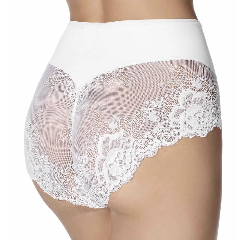 Кружевные трусики Джанира Грета с завышенной линий талии - белого цвета, с тонким полупрозрачным кружевом сзади - Janira Greta 1031447 / 31447 001. Ластовица из мелкой хлопковой гипоаллегренной махры.