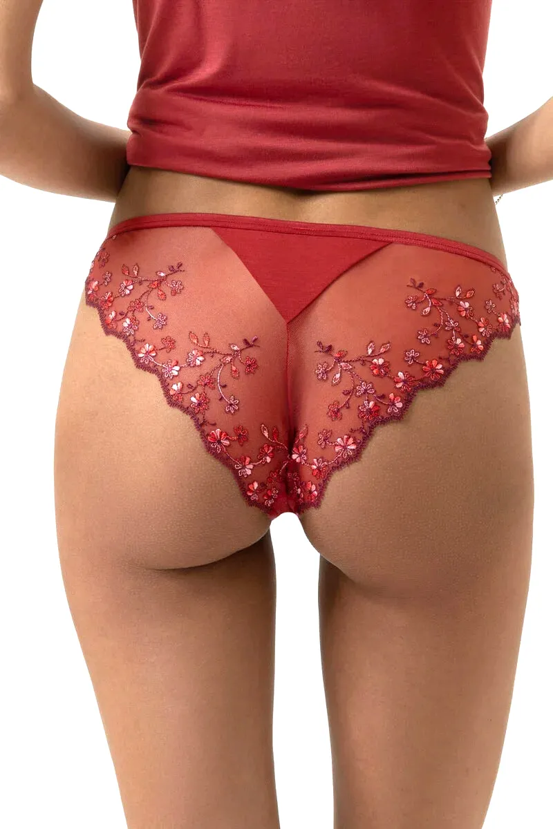 Кружевные трусы-бразтльяна Мей Делайтфул вишнёвого цвета - Mey Delighted Brasil 49227 1727 gala red. Роскошная вышивка с цветами на прозрачной сеточке. Ластовица из 100% хлопка. Сзади трусики полупрозрачные, из сетки с цветочной вышивкой, полотно сетки соединяется удобным центральным швом с игривым треугольничком. Впереди - непрозрачный материал с гладкой фактурой. Узкий эластичный поясок по линии талии из красивой шелковисто-сатиновой резинки. Изделие соответствует сертификату Oeko-Tex-Standard 100 - ткань выполнена из экологичных и безопасных для кожи материалов.
