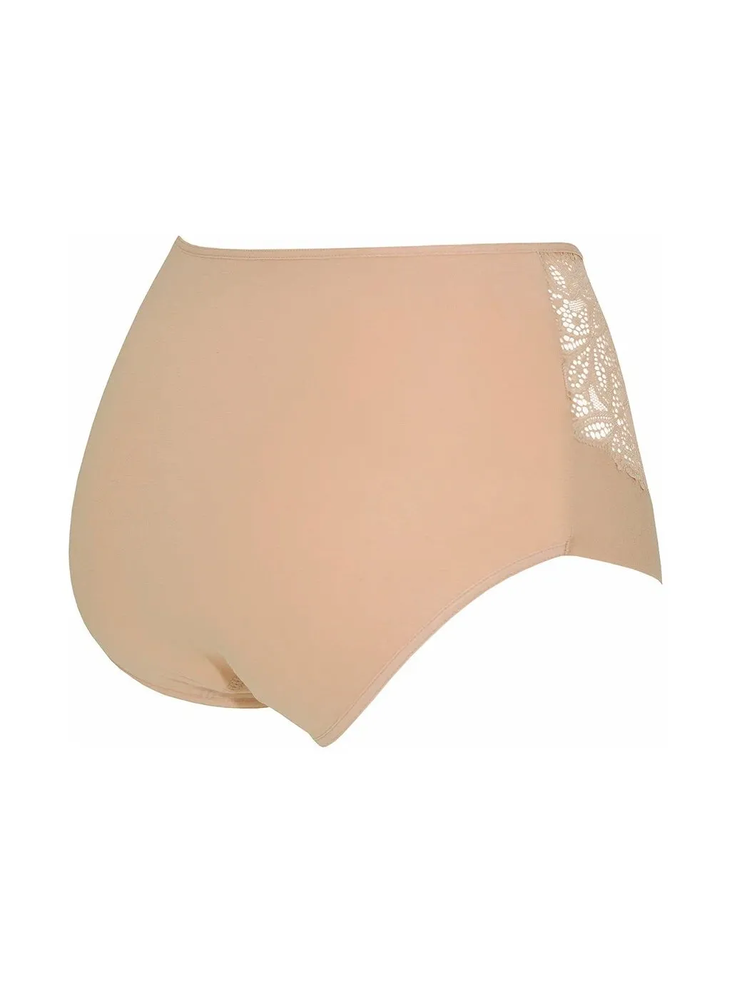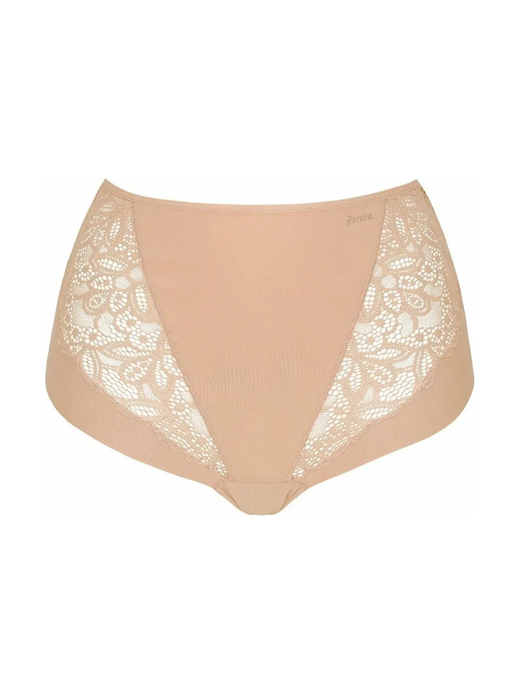 Высокие трусы Джанира Белль Коттон песочно-бежевого цвета, с тонким полупрозрачным кружевом - Janira Belle Cotton 1032307 483 dune (32307). Ластовица из мелкой хлопковой гипоаллегренной махры. Плоские швы, края изделия - сгиб сложенной вдвое ткани, комфортный, незаметный. Вырез ног сзади окантован тонкой эластичной кромкой.
