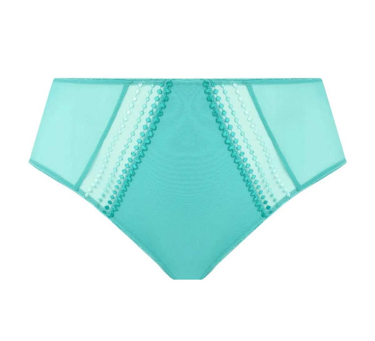 Высокие трусы брифы большого размера Elomi Матильда бирюзового цвета джейд, из соблазнительной прозрачной сеточки, с перламутровой вышивкой - Elomi Matilda Full Brief 8906 JAE Jade. Завышенная линия талии. Эффектная полупрозрачная многослойная сеточка сзади и по бокам. Впереди по центру - непрозрачная вставка из шелковистой ткани. Сзади - удобный центральный шов для лучшей посадки. По краю изделия проходит эластичная окантовка с сатиновой фактурой. Комфортная ластовица из 100% хлопка.