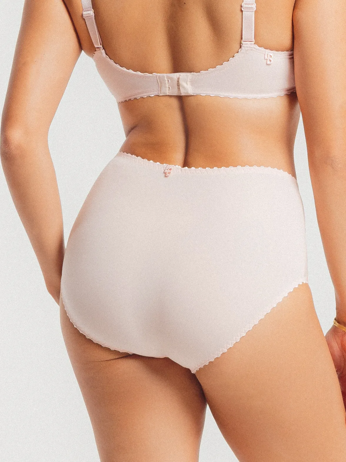 Высокие трусы Луиза Брак Элис нежно-розового цвета - Louisa Bracq Elise full brief baiser 419 50 NDR nude rose. Впереди текстурированная ткань в рубчик сочетается со вставками из прозрачного кружева с вышивкой. Сзади - гладкая матовая ткань и вышитый логотип LB. Линия талии и вырез ног с эластичной окантовкой. Завышенная талия сглаживает силуэт живота.