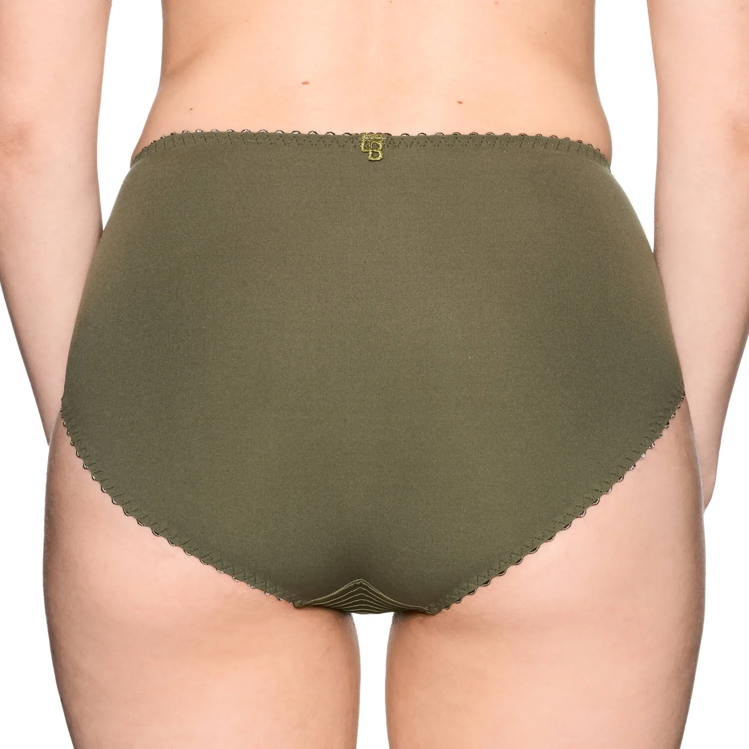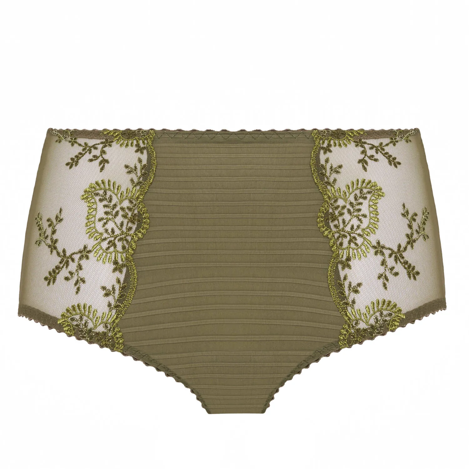 Высокие трусы Луиза Брак Элис оливково-зелёного цвета - Louisa Bracq Elise full brief baiser 419 50 OLV olive. Впереди текстурированная ткань в рубчик сочетается со вставками из прозрачного кружева с вышивкой. Сзади - гладкая матовая ткань и вышитый логотип LB. Линия талии и вырез ног с эластичной окантовкой. Завышенная талия сглаживает силуэт живота.