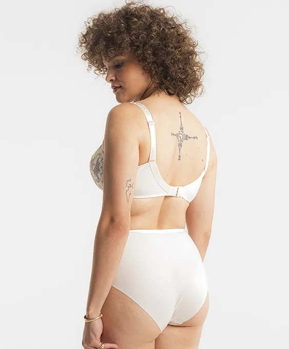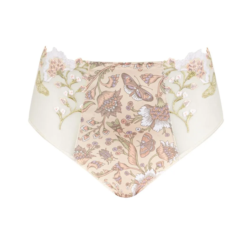 Высокие трусы Луиза Брак Флора с нежным принтом бабочки и цветы на светло-бежевом фоне лён - Louisa Bracq Flora full brief baiser 419 50 534 50 LIN. Впереди гладкая ткань с необычным принтом сочетается со вставками из прозрачного кружева с вышивкой. Сзади - гладкая матовая ткань и вышитый логотип LB. Линия талии и вырез ног впереди - с эластичной окантовкой. Края выреза ног сзади - бесшовные - не заметны под тонкой одеждой. Завышенная талия сглаживает силуэт живота. Ластовица - 100% хлопок.