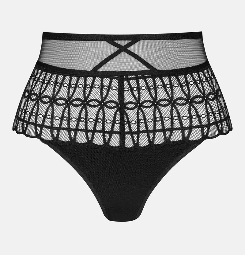 Высокие кружевные трусы Мей Captivating Захватывающая - чёрного цвета - Mey Captivating Taillenslip 1320014 3. Эффектная модель в винтажном стиле с декоративными стрепами. Ластовица из 100% хлопка. Выполнены из полупрозрачной текстурной сеточки в сочетании с прозрачной сеточкой-вуалью. Впереди - непрозрачный шелковистый треугольничек. Завышенная линия талии. По линии талии проходит узкая эластичная окантовка. Сзади кружевное полотно сходится в центральный шов, конструкция напоминает трусы-бразильяна.