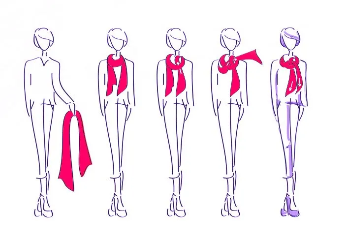 Для такого универсального способа подойдут и однотонные платки, и шарфы с принтами: мелкими, крупными, геометрическими или растительными орнаментами. Главное правило: принтованным должна быть либо основная одежда, либо сам шарф. В редких случаях можно красиво соединить мелкий геометрический орнамент юбки, брюк, рубашки и яркие крупные цветочные мотивы на шарфике. Но нужно руководствоваться чувством меры и вкусом.