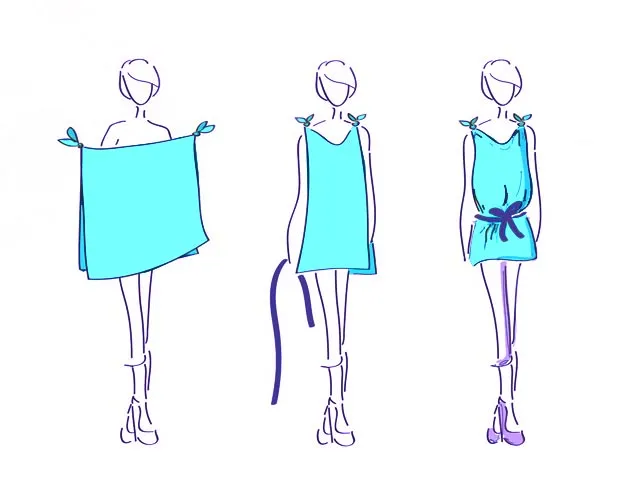 Чтобы получить яркий и необычный пляжный или летний аксессуар, два квадратных шёлковых платка одинаковой расцветки связываем узлами с двух ближайших углов, подвязываем широким или узким кожаным ремнем или плетеным поясом. Туника великолепно смотрится с узкими капри или узкими джинсами. Тонкая, легкая, воздушная, с оригинальными принтами – вы не сможете остаться незамеченной!